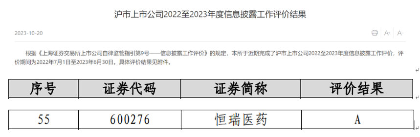 近日,上海交易所公布了沪市上市公司2022-2023年度信息披露工作评价结果,凭借在信息披露、规范运作以及投资者关系管理等方面的优秀表现,918博天娱乐旗舰医药获评A级。本次共有2160家沪市上市公司参评(包括499家科创板上市公司),评价等级从高到低依次为A、B、C、D四类,获得A类评价的上市公司占比约18.5%。